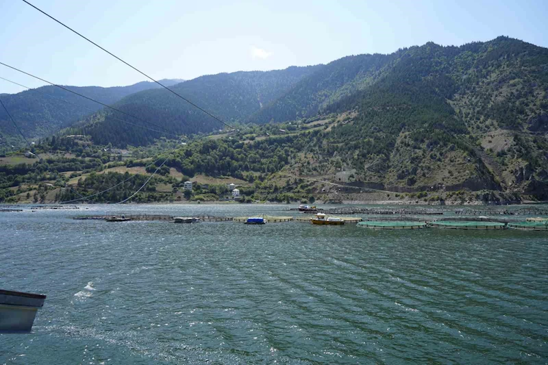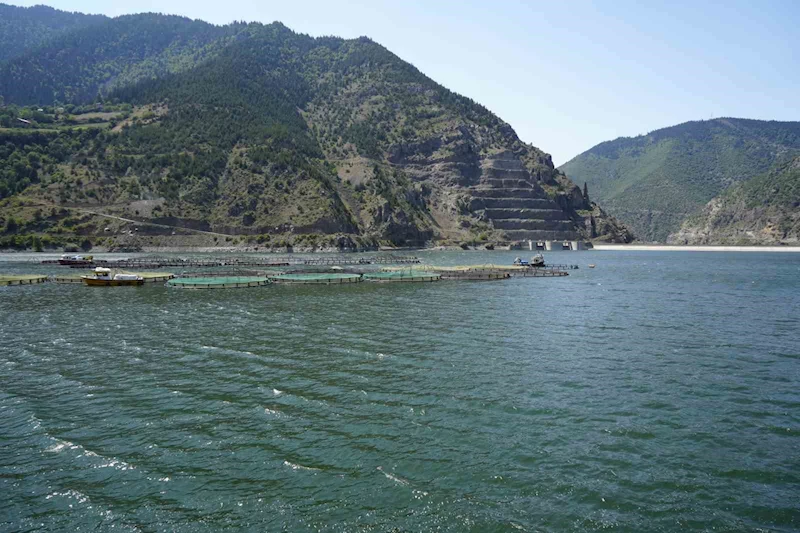 Gümüşhane'de Torul Baraj Gölü'nde su üzerinde yüzerek alabalık çiftliğindeki balıklarla karnını doyuran ayı kameralara yakalandı.
