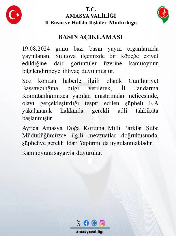 Sosyal medyada paylaşılan görüntülerin ardından Amasya Valiliği açıklama yaptı. Açıklamada, "Suluova ilçemizde bir köpeğe eziyet edildiğine dair görüntüler üzerine kamuoyunu bilgilendirmeye ihtiyaç duyulmuştur. Söz konusu haberle ilgili olarak Cumhuriyet Başsavcılığına bilgi verilerek İl Jandarma Komutanlığımızca yapılan araştırmalar neticesinde olayı gerçekleştirdiği tespit edilen şüpheli E.A. yakalanarak hakkında gerekli tahkikata başlanmıştır. Ayrıca Doğa Koruma ve Milli Parklar Şube Müdürlüğümüzce ilgili mevzuatlar doğrultusunda şüpheliye gerekli idari yaptırım da uygulanmaktadır" ifadelerine yer verildi.