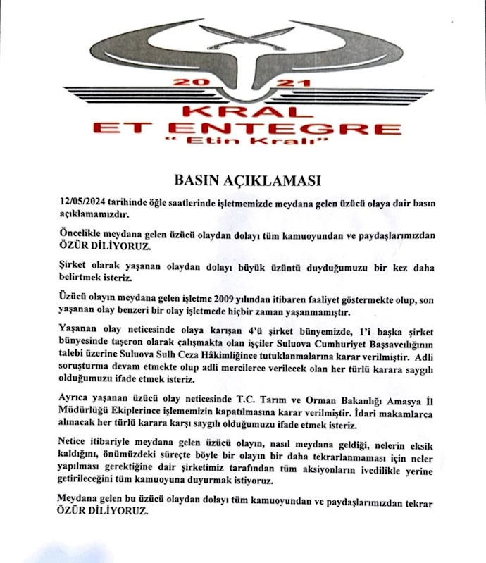 Olayın yaşandığı Kral Et Entegre tesisi işletmesi de açıklama yaptı. Açıklamada, "İdari makamlarca verilecek her türlü karara saygılı olduğumuzu ifade etmek isteriz. Meydana gelen bu üzücü olaydan dolayı tüm kamuoyundan ve paydaşlarımızdan tekrar özür diliyoruz" ifadelerine yer verildi.