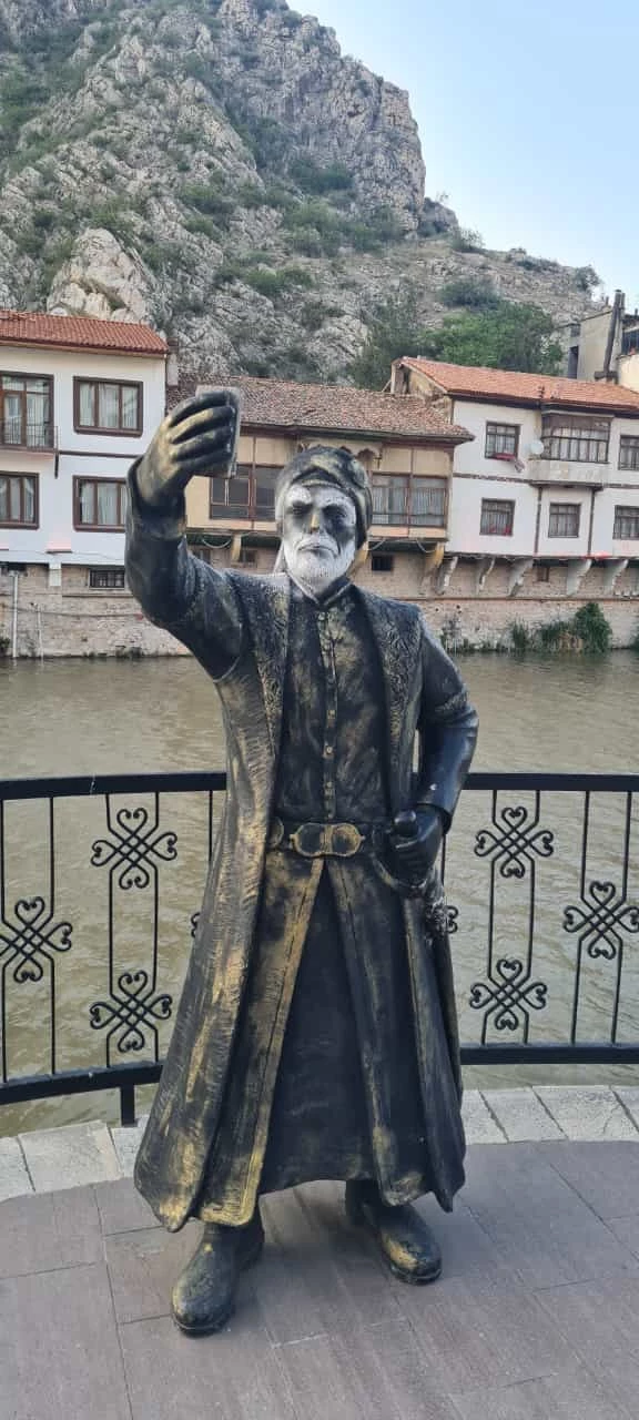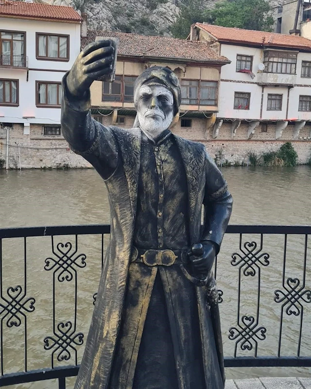Yeşilırmak'ın kıyısında 2015 yılından bu yana sergilenip şehre gelen turistlerinde olduğu binlerce kişinin selfie yaptığı heykelin cep telefonu ve kılıcı çok defa kırılması üzerine yenilenmişti.
