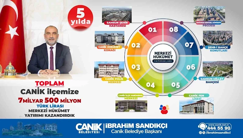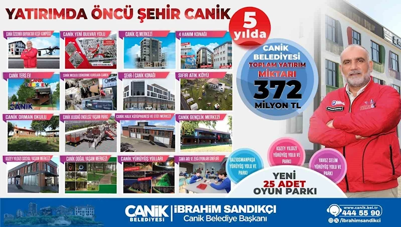 Canik Belediye Başkanı İbrahim Sandıkçı, ilçeye kazandırdıkları merkezi hükümet yatırımları ile belediye yatırımlarının önemine vurgu yaptı. Canik'in kazandırılan proje ve yatırımlarla yeni kimliğine kavuştuğunu ve Türkiye Yüzyılı'nda ilçenin gelişim sürecine katkılar sunacak yeni projeleri hayata geçirmeye devam edeceklerini ifade eden Başkan Sandıkçı, "Her alanda daha güçlü bir Canik için çalışmaya devam edeceğiz" dedi.