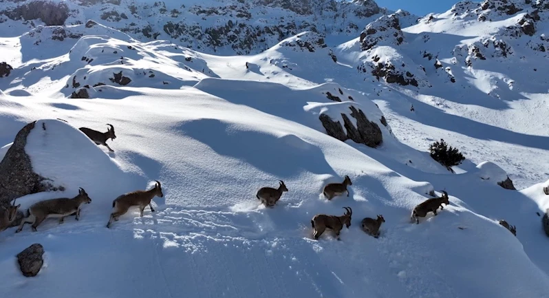 Yüksek ve kayalık alanları kendilerine mekân tutan dağ keçileri dağlara renk katıyor. Sürüler halinde görüntülenen dağ keçileri, karlar üzerinde bir süre gezinip gözden kayboldu.