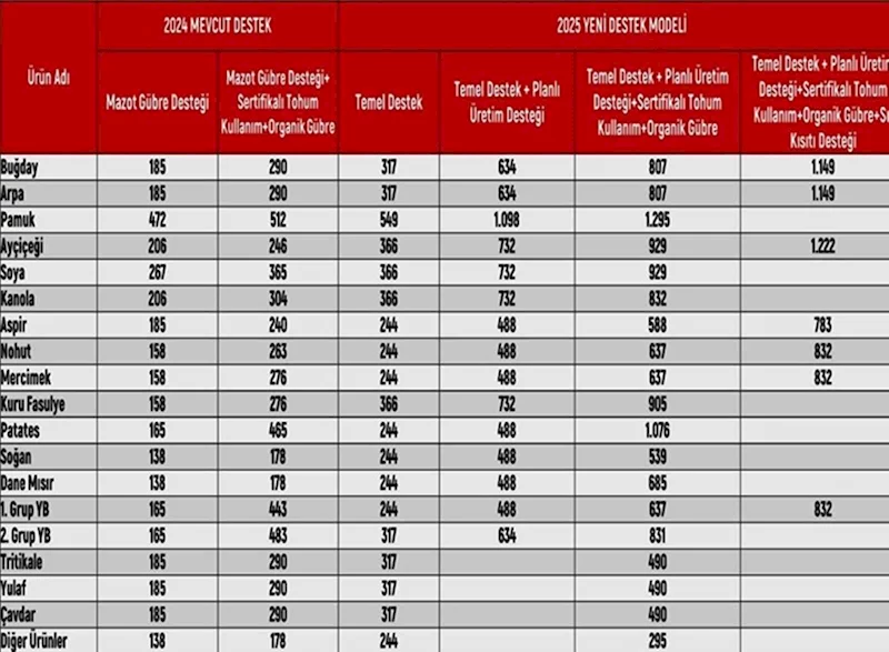 "Verim ve kaliteyi artırmak için sertifikalı tohum kullanım, sertifikalı/standart fidan kullanım, organik tarım, iyi tarım uygulamaları, katı organik-organomineral gübre destekleri verilmeye devam edilecek. Karar kapsamındaki diğer destekler de belli oldu. Biyolojik ve biyoteknik mücadele desteği kapsamında 2025 yılında örtü altı paket destek tutarı dekarda 2 bin 550 liradan yüzde 50 artırılarak 3 bin 825 liraya, açıkta paket destek tutarı dekara 870 liradan 1305 liraya çıkarıldı. Lisanslı depolarda muhafaza edilen ürünler için kira desteği, Ticaret Bakanlığı tarafından belirlenen kira ücret tarifesinin yüzde 75'i olarak ödenecek. Çiftlik Muhasebe Veri Ağı (ÇMVA) sistemine katılım primi desteği, bu sisteme dahil işletmeler için yüzde 50 artırılarak 1500 liraya yükseltildi. Tarımsal yayım ve danışmanlık desteği yüzde 104 artırılarak 294 bin liraya çıkarıldı. 2025-2027 dönemi bitkisel üretim planlaması havza ürün deseni listesinin de yer aldığı Cumhurbaşkanı Kararı'nın bazı maddeleri 1 Ocak 2025'ten, bazıları da 1 Mayıs 2025'ten itibaren yürürlüğe girecek olup mevcut bu desteklemelerle birlikte fark ödemesi desteği de çiftçilerimize ödenecektir."
