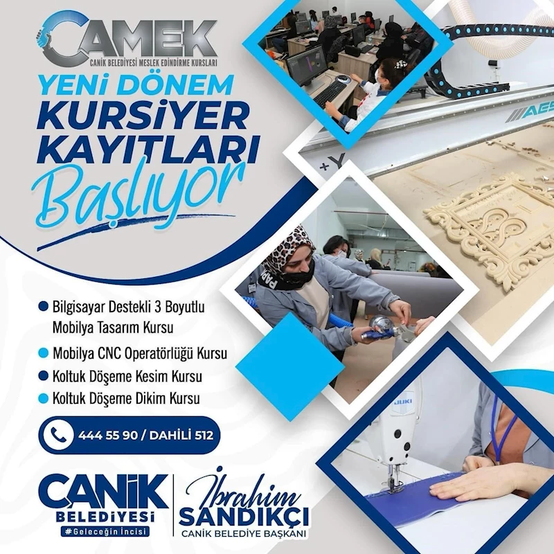 Canik Belediyesi Meslek Edindirme Kursları'nda yeni dönem kursiyer kayıtları başladı. Canik Belediyesi, CAMEK'in yeni eğitim döneminde vatandaşlara Bilgisayar Destekli 3 Boyutlu Mobilya Tasarım Kursu, Mobilya CNC Operatörlüğü Kursu, Koltuk Döşeme Kesim Kursu ve Koltuk Döşeme Dikim Kursu olmak üzere 4 farklı eğitim modülünde ücretsiz sertifikalı mesleki eğitim programı gerçekleştirecek.