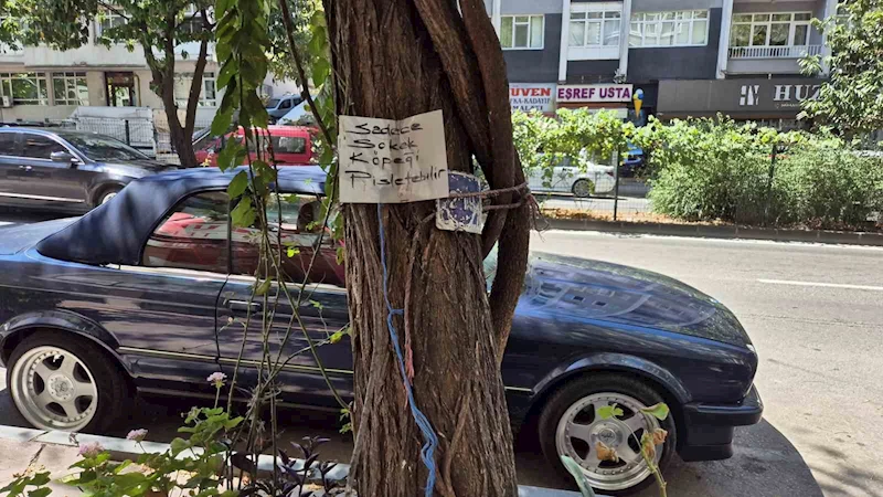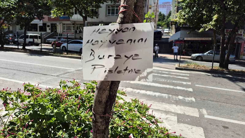 Hayvan sahiplerinin bilerek ürünlerin üstüne evcil hayvanlarının dışkısını yaptırmasına sinirlenen esnaf ağaca, "Hayvan, hayvanını buraya pislettirme", "Sadece sokak köpeği pisleyebilir" yazılı notlar astılar.