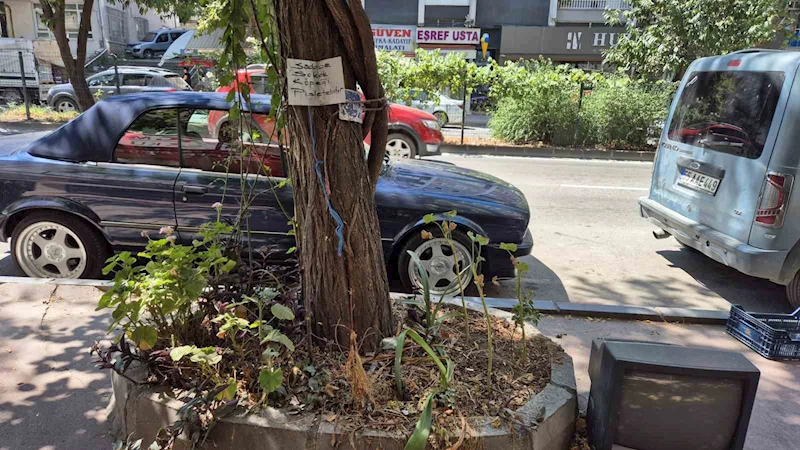Samsun'da işyerinin önündeki ağaçlık alana sebze, meyve ve çiçek eken esnaf, ürünleri evcil hayvan dışkılarından korumak için kağıda ilginç notlar yazarak ağaca astı.
