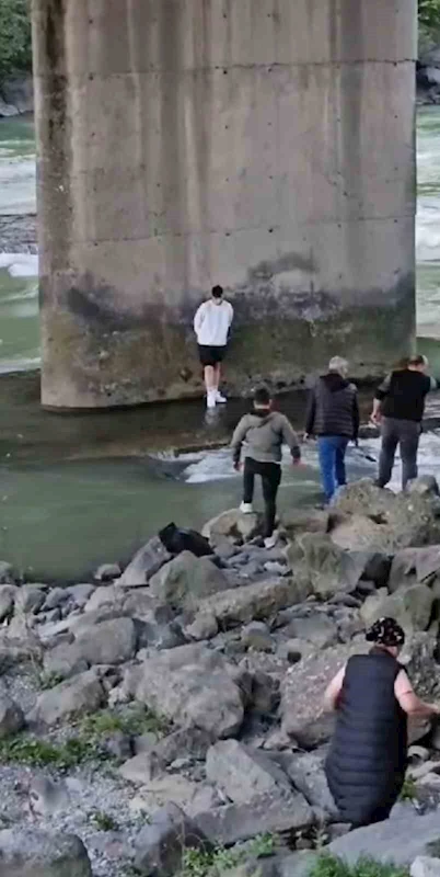 Artvin'in Borçka ilçesinde bir genç balık tutmak için gittiği Çoruh Nehri'nde baraj kapakları açılıp nehrin debisi yükselince köprü ayağında mahsur kaldı.