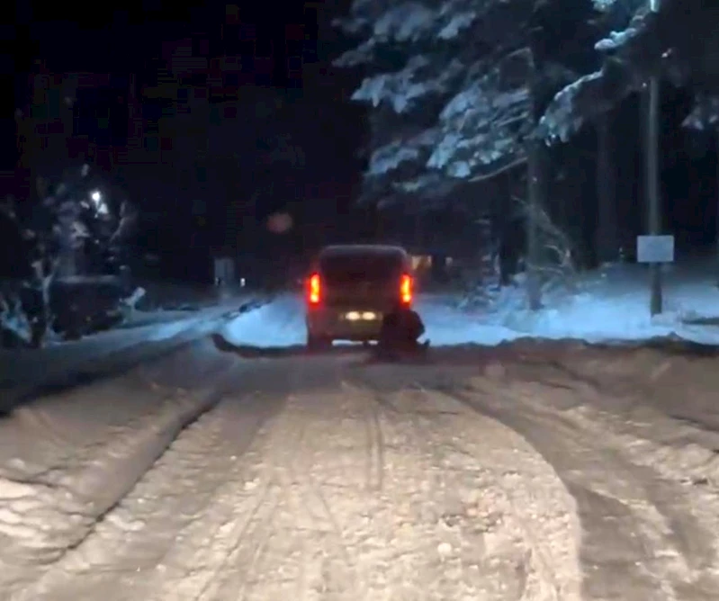 Bolu'da karlı yolda aracın arkasına şambrel bağlayarak kayan vatandaşların tehlikeli anları kameraya yansıdı.