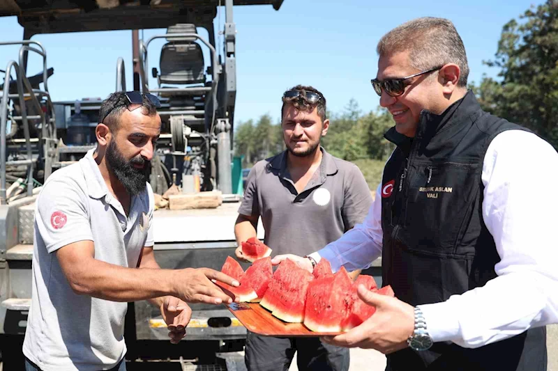 Çalışmaları yerinde inceleyen Vali Selçuk Aslan, "Çevreyi koruyarak ilimizin turizm potansiyelini arttırmak için tüm paydaşlarımızla gerekli yatırımları yapmaya devam edeceğiz" dedi ve çalışanlara karpuz ikram etti.