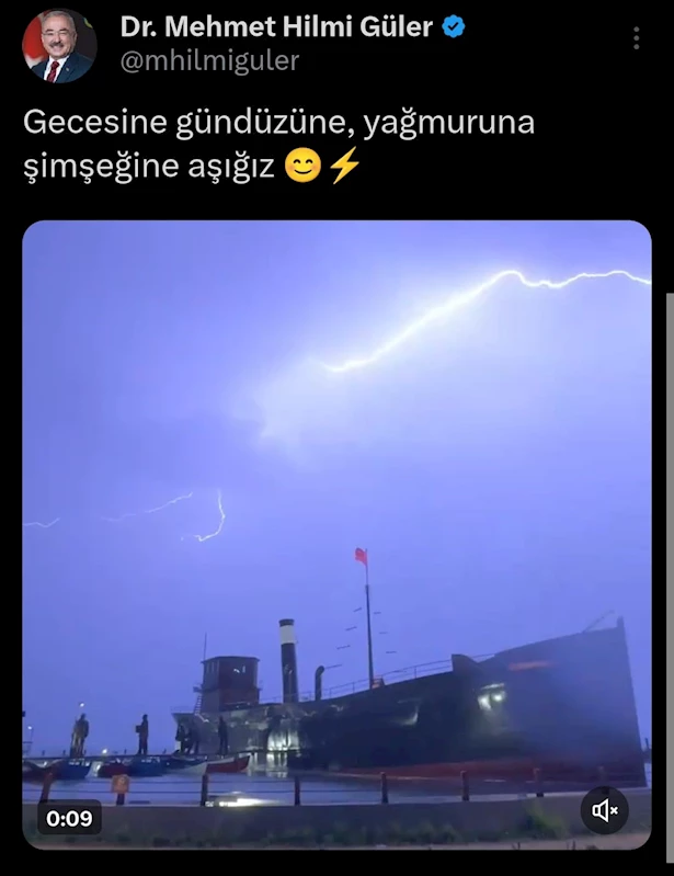 Ordu Büyükşehir Belediye Başkanı Dr. Mehmet Hilmi Güler, şimşeklerin geceyi aydınlattığı o anları paylaştı. Başkan Güler, Kurtuluş Savaşı'nın önemli destanlarının yer aldığı ve bu kahramanlıkların gelecek kuşaklara aktarılması adına Ordu Büyükşehir Belediyesi tarafından yapılarak hizmete açılan 'Rüsumat No:4 Gemi ve Müzesi'nin de yer aldığı görüntüleri sosyal medya hesaplarından, "Gecesine gündüzüne, yağmuruna şimşeğine aşığız" notu ile paylaştı.