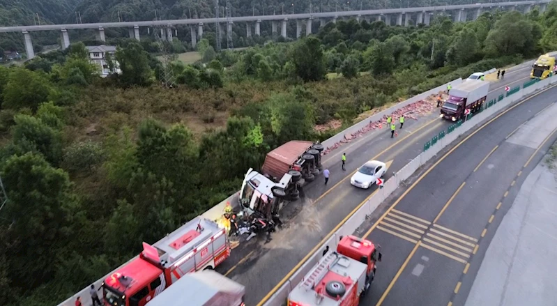 Kaza, Bolu Dağı İstanbul istikameti Darıyeri Hasanbey Köyü mevkiinde meydana geldi. Alınan bilgilere göre Bolu'dan Sakarya istikametine seyir halinde olan E.U.K. idaresindeki 34 CZF 847 plakalı Mercedes marka tır, sürücüsünün direksiyon hakimiyetini kaybetmesi sonucu önce V.O. idaresindeki 51 ACF 797 plakalı Ford marka otomobile, ardından A.T. idaresindeki 06 VT 387 plakalı Mercedes marka otobüse çarpmasının ardından A.C. idaresindeki 07 MAS 11 plakalı otomobilin üzerine devrildi. İstanbul istikameti trafiğe kapanırken bölgeye, sağlık, polis, jandarma ve itfaiye ekipleri sevk edildi. Tırın altında kalan otomobildeki sürücü yaklaşık 1,5 saatlik çalışmanın ardından sıkıştığı yerden kurtarıldı. Yaralı sürücü ambulansla hastaneye kaldırılırken, yol tek şeritten trafiğe açıldı. Kazada tırın kaldırma çalışmalarına ise başlandı.