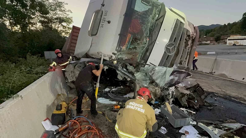 Düzce'de makarna yüklü tır, sürücüsünün direksiyon hakimiyetini kaybetmesi sonucu otobüs ve otomobile çarpmasının ardından bir başka otomobilin üzerine devrildi. Kazada 1 kişi yaralandı.