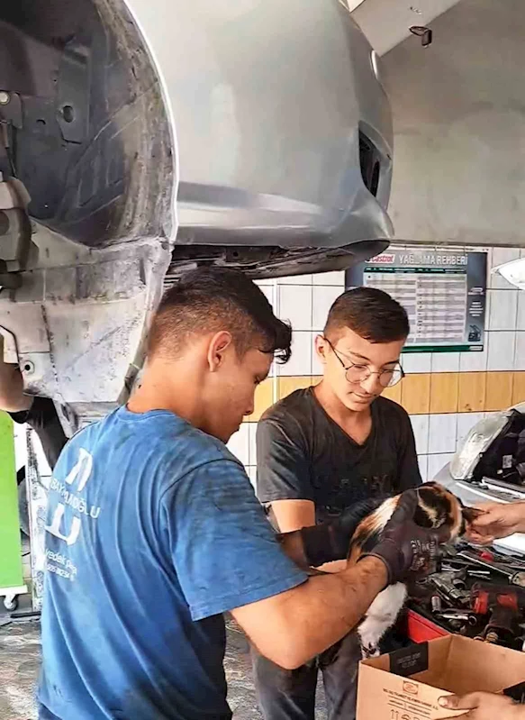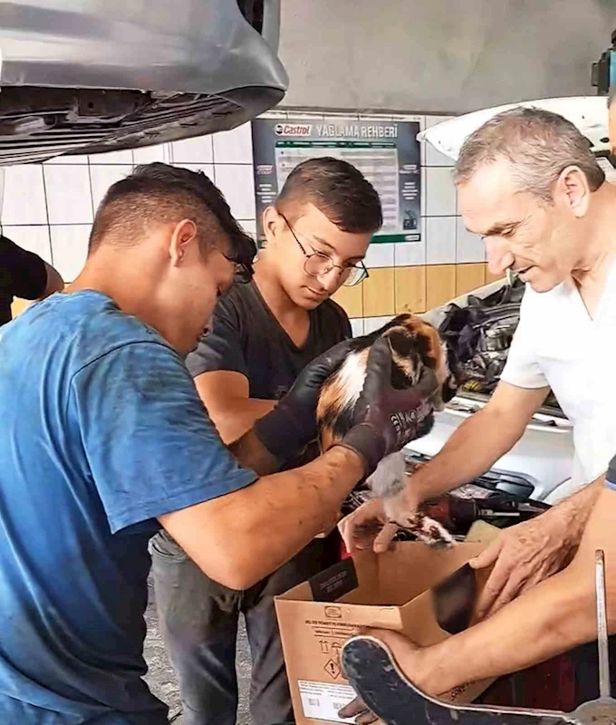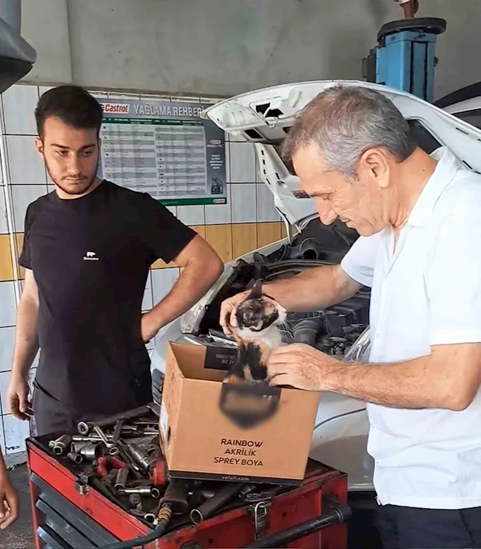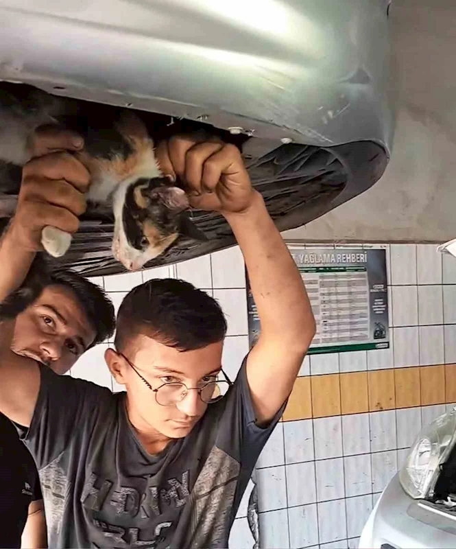 Samsun'un Terme ilçesinde otomobilin motor kısmındaki devirdaim kayışına sıkışan kediyi kurtarmak için araç sahibi ve ustalar seferber oldu.