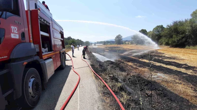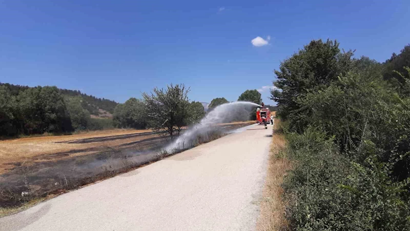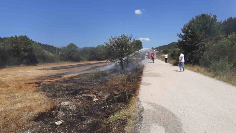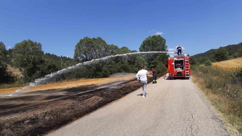 Bolu'nun Mudurnu ilçesinde çıkan anız yangını söndürüldü. Yangına ilk müdahaleyi yapan İlçe Belediye Başkanı Doğan Onurlu, "Aracımızdaki su şişeleriyle ilk müdahaleyi yaptık. Rüzgarın etkisiyle büyüdü. Sigara izmaritinden çıktığını düşünüyoruz" dedi.