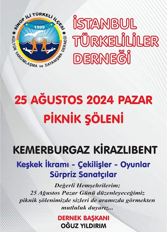 Dernek Başkanı Oğuz Yıldırım, "Değerli hemşehrilerim, 25 Ağustos Pazar günü düzenleyeceğimiz piknik şölenimizde sizleri de aramızda görmekten mutluluk duyarız" diyerek, tüm Türkelilileri geleneksel şölene davet etti.