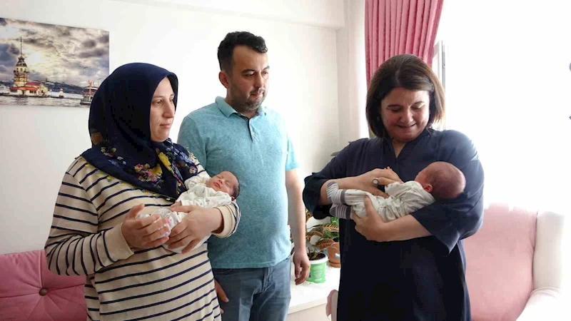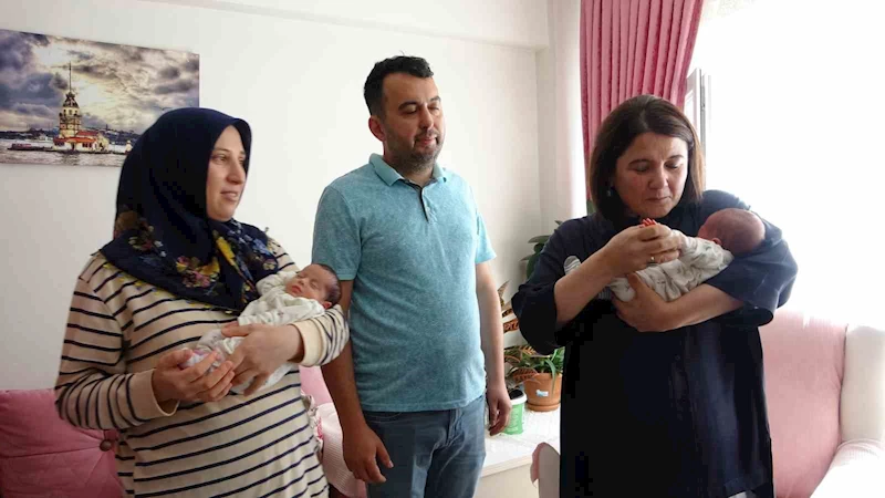 Üçüz bebekleri kucağına alan Vali Serdengeçti, bebekleri sevdi. Ailenin üçüz sevgisine ortak olan Vali Serdengeçti ve eşi Belkıs Edige Serdengeçti aileye tavsiyelerde bulunarak her bir bebeğe altın hediye taktı.