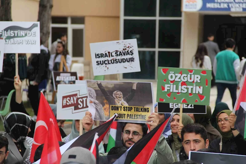 Üniversite öğrencileri adına bir açıklama yapan Furkan Şentürk, 7 Ekim Aksa Tufanı sonrasında gelişen olaylar, insanlık tarihinin en vahşi katliamlarından birinin yanında yine insanlık tarihinin en şerefli ve sebatkar direnişlerinden birini tüm dünyanın gözleri önüne serdiğini söyledi.
