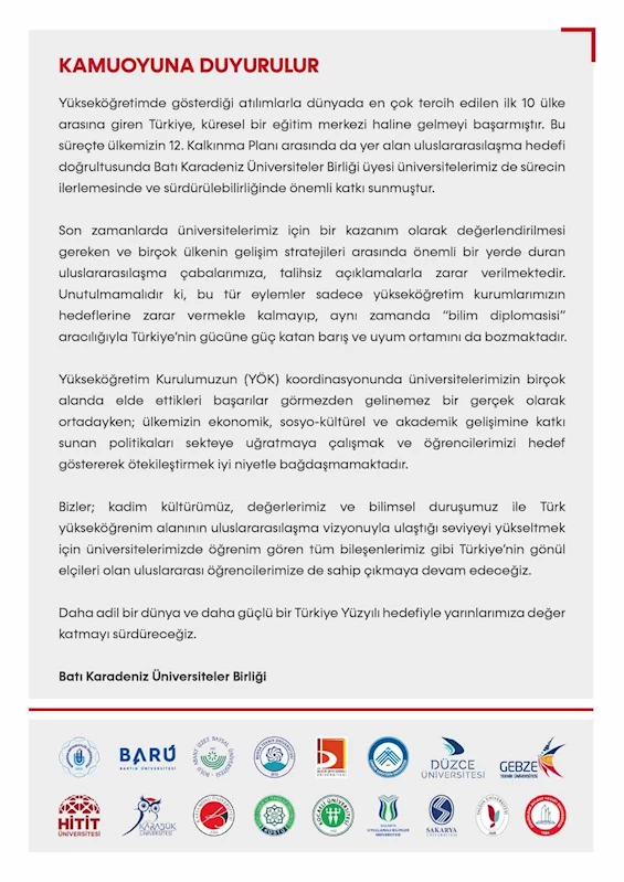 Batı Karadeniz Üniversiteler Birliği üyesi 17 üniversite, son dönemlerde yabancı öğrenciler aleyhine yapılan açıklamalarla ilgili yayınladıkları ortak bildiride, "Türkiye’nin gönül elçileri uluslararası öğrencilerimize sahip çıkmaya devam edeceğiz" ifadelerine yer verdi.