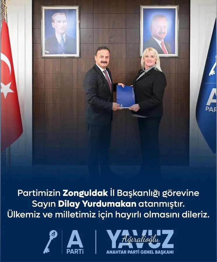 Anahtar Parti, Zonguldak İl Başkanlığı görevine Dilay Yurdumakan’ın atandığını duyurdu. Parti tarafından yapılan açıklamada, yeni görevlendirmenin Zonguldak teşkilatına güç katacağı ifade edilirken, “Ülkemiz ve milletimiz için hayırlı olmasını dileriz” denildi. Yurdumakan’ın göreve atanmasıyla birlikte partinin Zonguldak’taki çalışmalarının yeni dönemde daha koordineli ve etkili şekilde devam edeceği vurgulandı. Açıklama, partinin resmi sosyal medya hesapları üzerinden paylaşıldı.