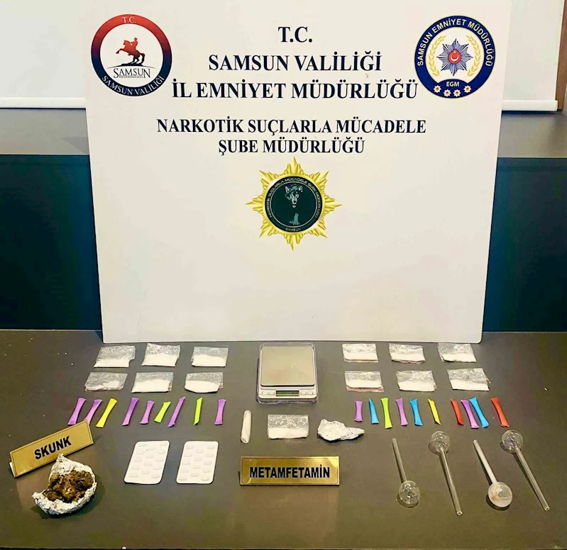 Edinilen bilgiye göre, Samsun Cumhuriyet Başsavcılığı koordinesinde uyuşturucu ile mücadele kapsamında çalışma yapan Samsun Emniyet Müdürlüğü Narkotik Suçlarla Mücadele Şube Müdürlüğü ekipleri İlkadım ilçesi Karasamsun Mahallesi’nde M.O.Ç. isimli şahsın aracında ve ikametinde arama yaptı. Yapılan aramada aramada 36 paket halinde 83,81 gram metamfetamin, 14,91 gram skunk, 25 adet sentetik ecza ve 1 adet hassas terazi ele geçirildi.