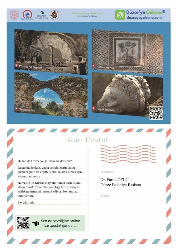 Düzce Belediye Başkanı Dr. Faruk Özlü de Kurban Bayramı online kartpostal kampanyasına destek vererek, Prusias Ad Hypium Antik Kenti, Aslanlı Mozaik, Su Kemerleri ve Büyük İskender portresi fotoğraflarının yer aldığı kartpostalı 245 belediye başkanına iletti.