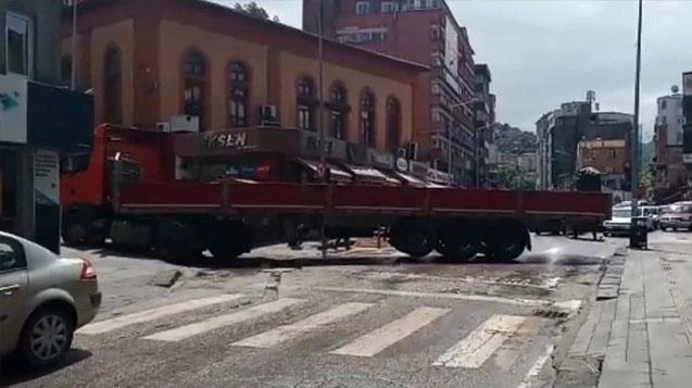 Zonguldak kent merkezinde ara sokaktan ana caddeye çıkmak isteyen tır sürücüsü trafiği birbirine kattı.
