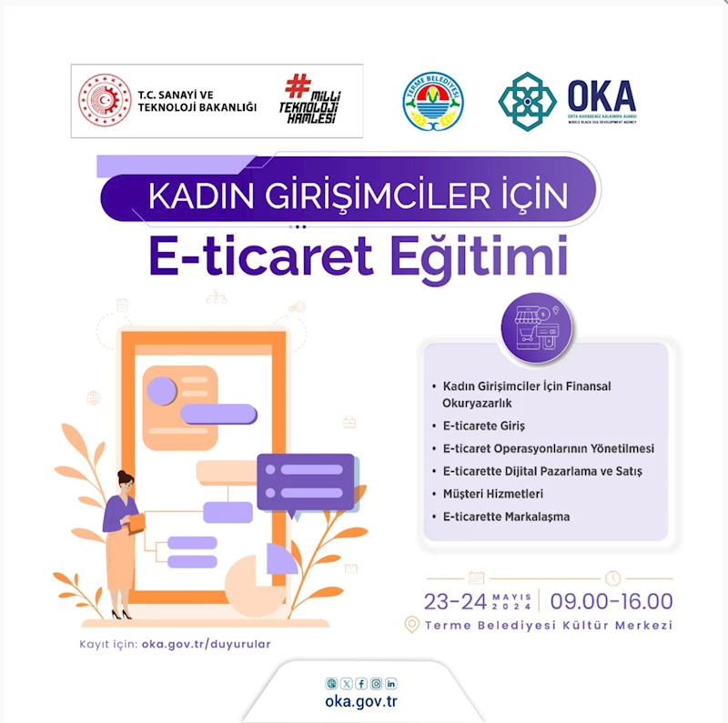 Terme Belediyesi ve Orta Karadeniz Kalkınma Ajansı (OKA) iş birliği ile 23-24 Mayıs tarihlerinde Terme Kültür Merkezi Konferans Salonunda kadın girişimcilere yönelik e-ticaret eğitimleri düzenlenecek.