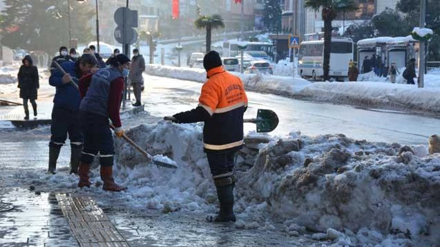 Temizlik İşleri, Fen İşleri ve Su Kanalizasyon İşleri Müdürlüğü ekipleri ellerinde küreklerle kaldırım ve yaya yollarını temizliyor. İş makineleri kentin 600 kilometrelik yol ağında bütün mahallelerde temizlik çalışmalarına devam ediyor.