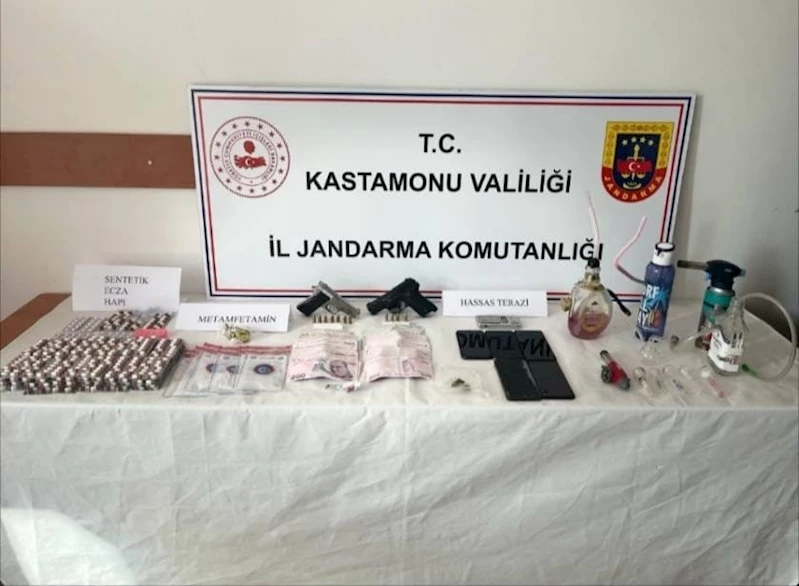 Edinilen bilgiye göre, Kastamonu İl Jandarma Komutanlığı ekiplerince uyuşturucu madde imal ve ticaretinin önlenmesine yönelik yürütülen çalışmalar neticesinde Merkez ilçesinde 6 şahsa ait 4 ayrı adreste arama yapıldı. Yapılan aramada 760 adet sentetik ecza hapı, 52 gram metamfetamin, 2 adet ruhsatsız tabanca, tabanca mermisi, esrar, 9 adet cep telefonu, hassas terazi, suçtan elde edildiği değerlendirilen 36 bin 820 TL para ele geçirildi.