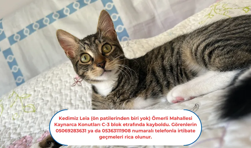 Kedimiz Leia (ön patilerinden biri yok) Ömerli Mahallesi Kaynarca Konutları C-3 blok etrafında kayboldu. Görenlerin 05069283631 ya da 05363111908 numaralı telefonla irtibate geçmeleri rica olunur.