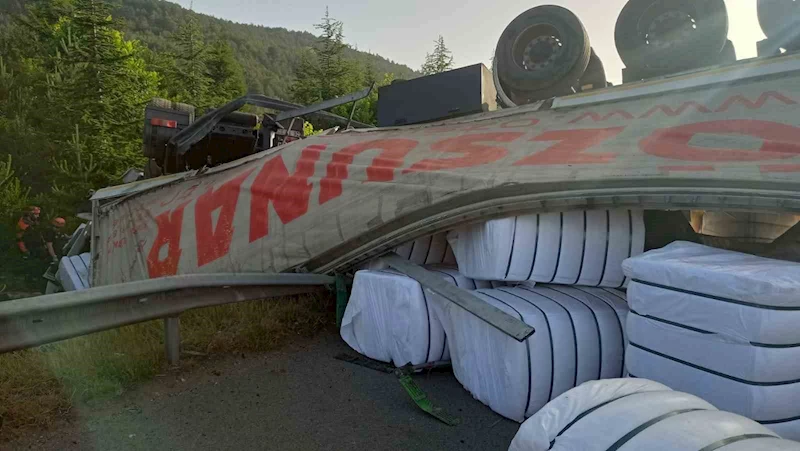Anadolu Otoyolunun Bolu geçişinde kontrolden çıkan tır, dorsesiyle birlikte tepetaklak oldu.