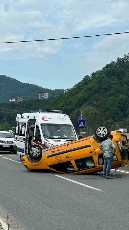 Trabzon’un Araklı ilçesinde ticari taksi sürücüsü köpeğe çarpmamak için manevra yapınca araç takla attı.