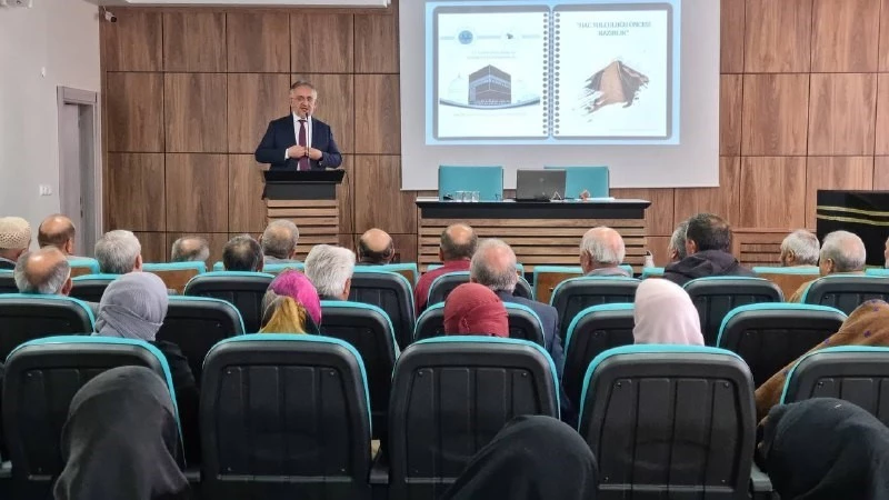 Hac ve Umre Şube Müdürü Sadi Bayoğlu, sunumlar ve uygulamalı olarak hac yolculuğu hakkında hacı adaylarına hatırlatmalarda bulundu.