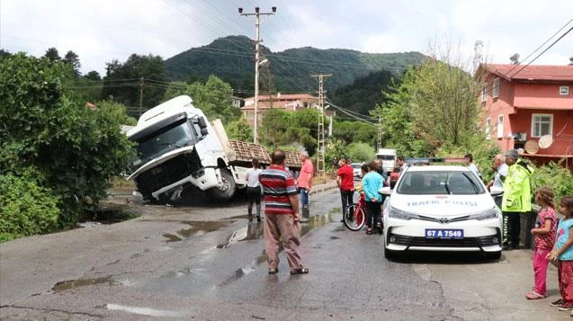 Kaza sabah saatlerinde Hamzafakıhlı Mahallesi'nde meydana geldi. İddiaya göre sabah saatlerinde başlayan yağmurla oluşan sular kanalların tıkanması sonucu yola taştı. Yoldaki yağmur sularından kanalı fark edemeyen sürücü idaresindeki 67 TY 042 çekici ve 67 LY 442 plakalı tırın sağ tekerleklerini su kanalına düşürdü. Su kanalına yan yatan tırın dorsesinde ki yaklaşık 30 tonluk sacda yerinden oynadı. Kazada şans eseri yaralanan olmazken mahalle sakinleri ise duruma tepki gösterdi. Mahalle sakinlerinden Müyesser Bozkurt, tırların hem hızlı gittiğini hem de kazalar nedeniyle çocuklarının sürekli tehlike altında olduğunu söyledi. Yüksek tonajlı yük taşıyan tırların geçişi sırasında deprem oluyormuşçasına evlerinin sallandığını dile getiren Bozkurt, yetkililerden bu duruma çözüm bulmalarını istedi.
