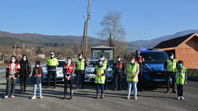 Jandarma ve polis ekipleri ile birlikte Yenice - Zonguldak karayolunda uygulama yapan öğrenciler durdurulan araçlarda bulunan vatandaşlara maske, mesafe ve temizlik kurallarına uymaları konusunda uyarıda bulundular.