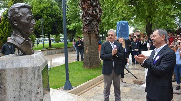 Heykelin açılışının ardından Kaymakam Madenoğlu ve Başkan Uysal tarafından heykeltıraş Yaman Civan'a plaket takdim edildi.