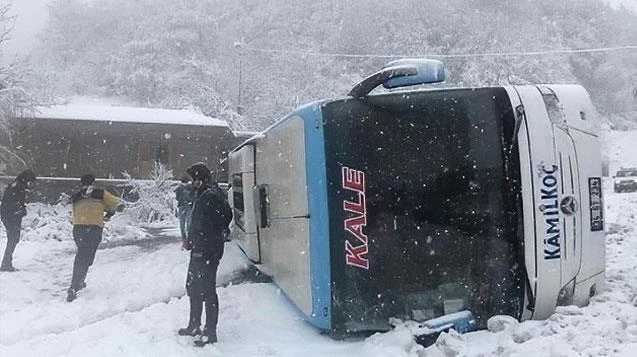 Zonguldak'tan 10.30'ta İstanbul'a yola çıkan Ramazan D. idaresindeki 34 GV 234 plakalı Kamil Koç firmasına ait Mercedes marka otobüs Ereğli istikametine seyir halindeyken yoğun kar yağışı ile birlikte direksiyon hakimiyetini kaybederek devrildi.