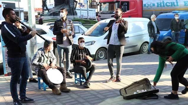 Gazipaşa Caddesi'nde bir grup genç, yeni yıl öncesi klarnet, darbuka, keman eşliğinde vatandaşlardan para toplamak istedi. Kısa sürede vatandaşlar kaldırım üzerinde yoğunluk oluşturdu. Kalabalığı fark eden polis ekipleri olay yerini boşaltmak istedi. Polisleri görünce toplanmaya başlayan gençler, 'Başka bir yere gidelim' deyince polisler de pandemi kurallarını hatırlatarak 'Başka bir yer yok' dedi.