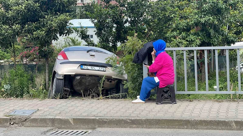 Rize’de yoldan çıkan araç kaldırımla bahçe arasında asılı kaldı. Kazada sürücünün burnu bile kanamadı.