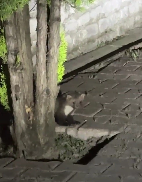 Emek Mahallesi’nde vatandaşlar bir sitenin bahçesinde sansar fark etti. Site bahçesinde bir süre çevreyi kontrol eden sansar, yavrusunu da ağzına alarak uzaklaştı.