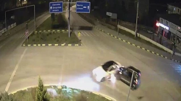Bartın'da kavşakta meydana gelen kazada ise iki farklı güzergahtan gelen araçlar kafa kafaya çarpışıyor. Metrelerce savrulan her iki araç refüje ve bariyerlere çarparak durduğu yer alıyor. Öte yandan hafif ticari araç ile çarpışan otomobil kavşakta ters dönerken kazada 7 kişi yaralandı