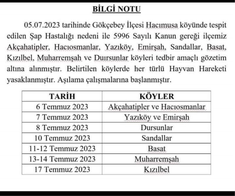 Gökçebey’in Hacımusa köyünde büyükbaş hayvanlarda şap hastalığı tespit edildi. 5996 sayılı kanun gereği Çaycuma ilçesinde Akçahatipler, Hacıosmanlar, Yazıköy, Emirşah, Sandallar, Basat, Kızılbel, Muharremşah ve Dursunlar köyleri olmak üzere toplam 9 köyde tedbir amaçlı gözetim altın altına alındı. Belirtilen köylerde herhangi bir hayvanda şap hastalığı olmadığı ve söz konusu köylerde tedbir amaçlı hayvan hareketleri yasaklandığı öğrenildi.
